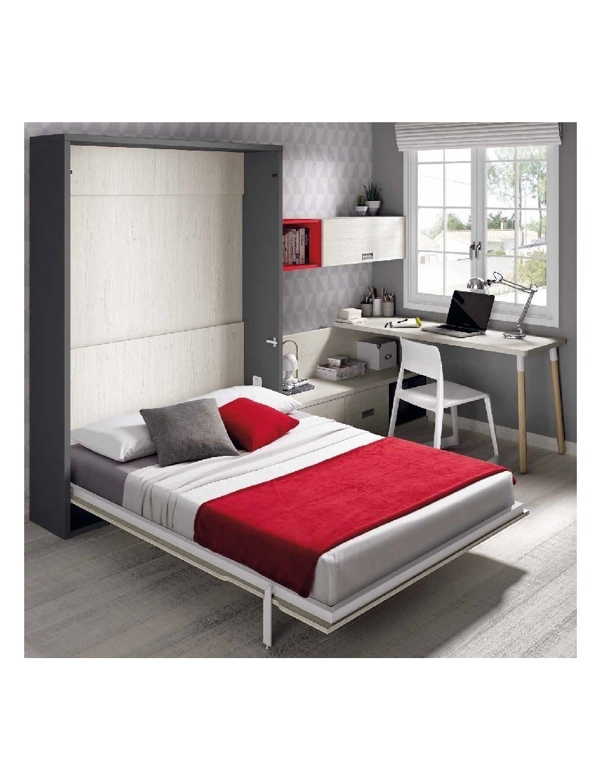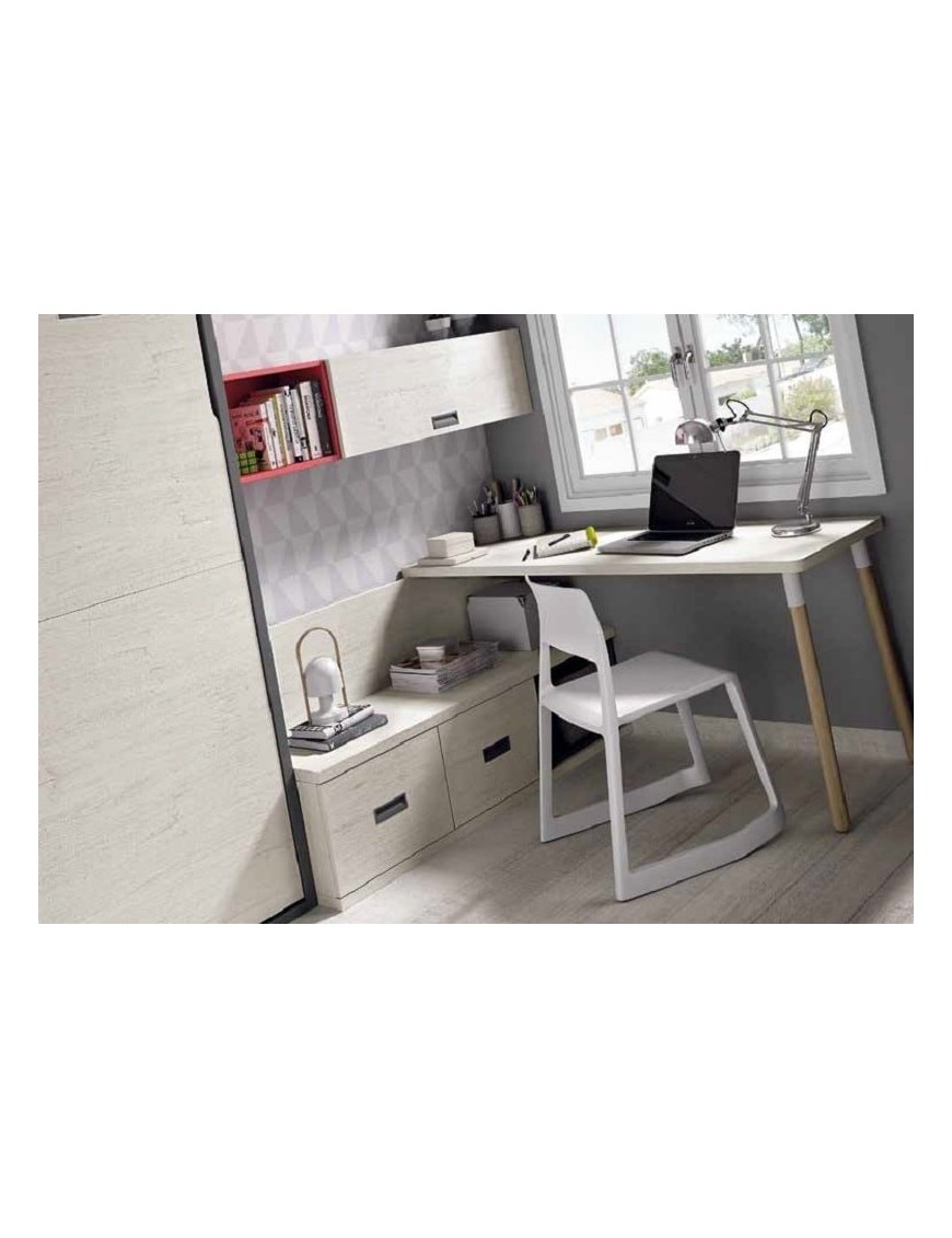 Utilizamos una zona de estudio para añadir una cama abatible para colchones de 135 x 190 x 18 cm, el sistema de patas es automático, según baja la cama las patas van saliendo.