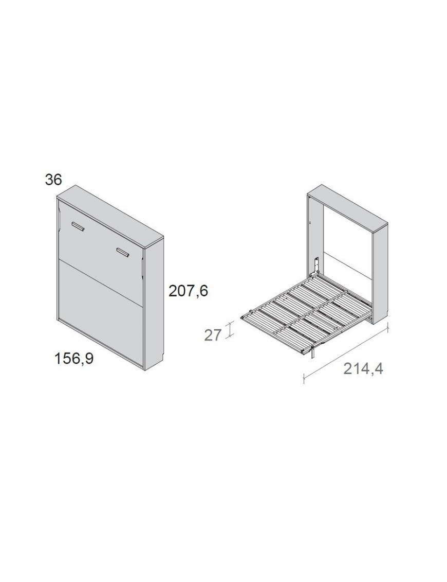 La cama abatible tiene unas dimensiones de 157 cm de frente, un fondo reducido de 36 cm y un alto de 208 cm, y lleva incorporado somier de lamas, muy apropiado para todo tipo de colchones. La cama plegable una vez abierta desplaza a 214,4 cm. (posibilidad de otras medidas de colchón 90x190 cm, 90 x 180 cm. 105 x 190 cm y 150 x 190 cm). También se le puede añadir un altillo para guardar la almohada (no incluido en el precio).