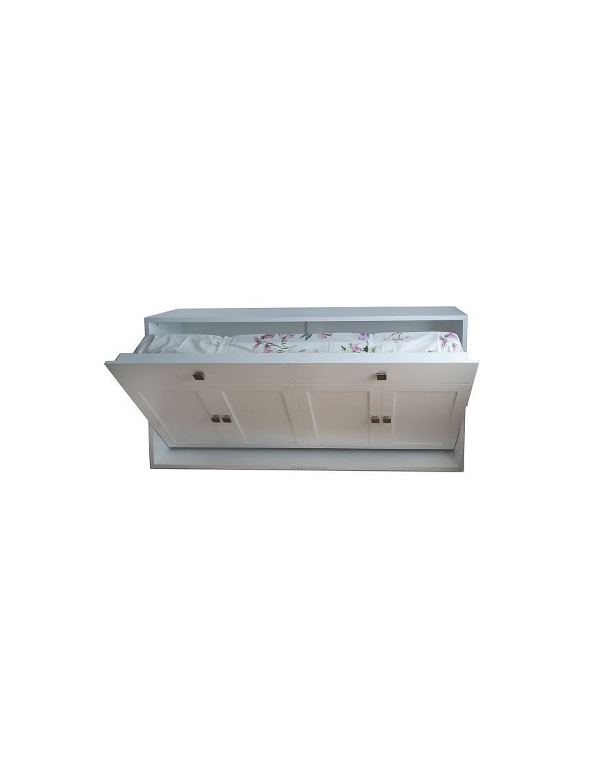 Mueble aparador con una cama abatible horizontal lacado en blanco con tiradores cuadrados metálicos. Las camas abatibles incluyen un somier de hierro con tableros de macizos de MDF, especialmente diseñado que viene provisto de seguro para bloquear la cama, dos potentes hidráulicos para que no nos cueste esfuerzo abrir o cerrar la cama y con posicionamiento automático de patas.