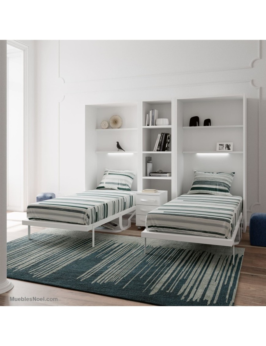 Muebles para un dormitorio juvenil largo y estrecho con camas abatibles verticales para 105, modelo Dálmata, con mesa estudio sincronizada, con lo que no hay que quitar nada de la mesa cuando abrimos la cama.