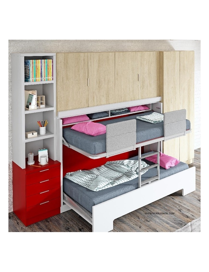 Se fabrica para colchones de 180, 190 y 200 cm de largo. Con 2 fondos de mueble cerrado 62 y 52 que repercute en el grosor del colchón de arriba (de 15 o de 11 cm respectivamente) y en la ocupación con las camas abiertas, 143 cm abierta con 62 cm cerrada y 133 con 52. En el precio incluimos un quitamiedos de regalo.