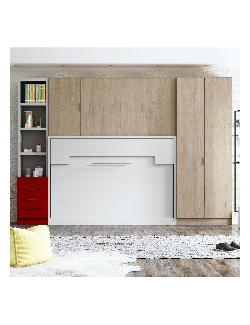 La cama litera plegable horizontal blanca que ofrecemos por 2583€, es apta para sujetar en paredes con pladur, es para colchones de 105 x 190 cm y arriba de 90 x 190 cm, está fotografiada en rojo, acacia y blanco. Camas. Mide 143,5 cm de alto por 208,5 de largo por 52 cm de fondo y abierta 133 cm. Dispone de sistema de apertura automático de patas en la cama baja. Incluye 2 quitamiedos de serie.