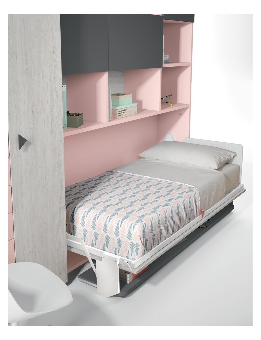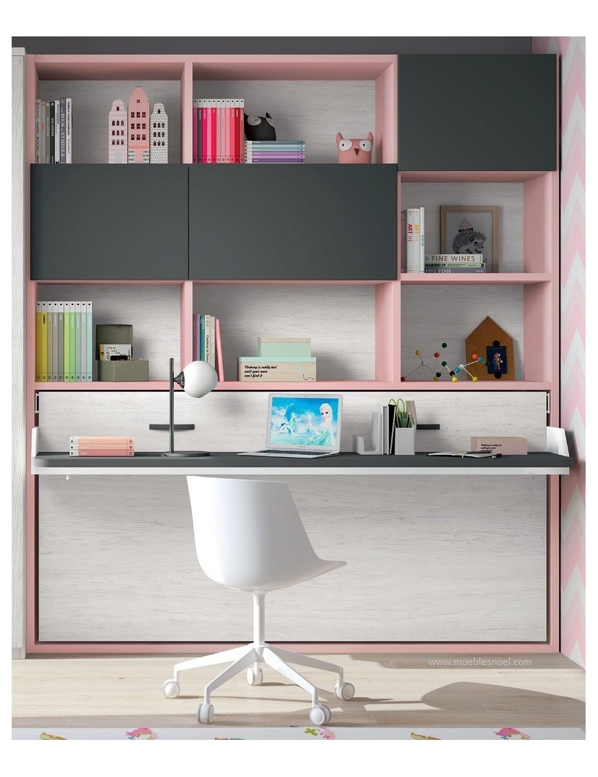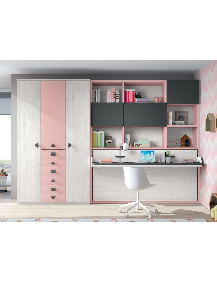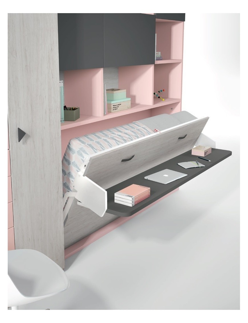 Los colores del hábitat juvenil del armario que acompaña a la cama abatible horizontal con mesa y que no está incluido en el precio son el Rosa, Pizarra y el Ártico con Metal Curvo.