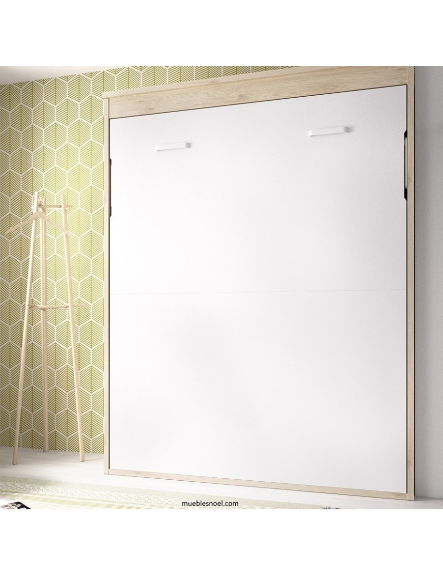 Cama abatible vertical de matrimonio con patas automáticas. Mueble cama para colchones grandes preparada para uso diario.