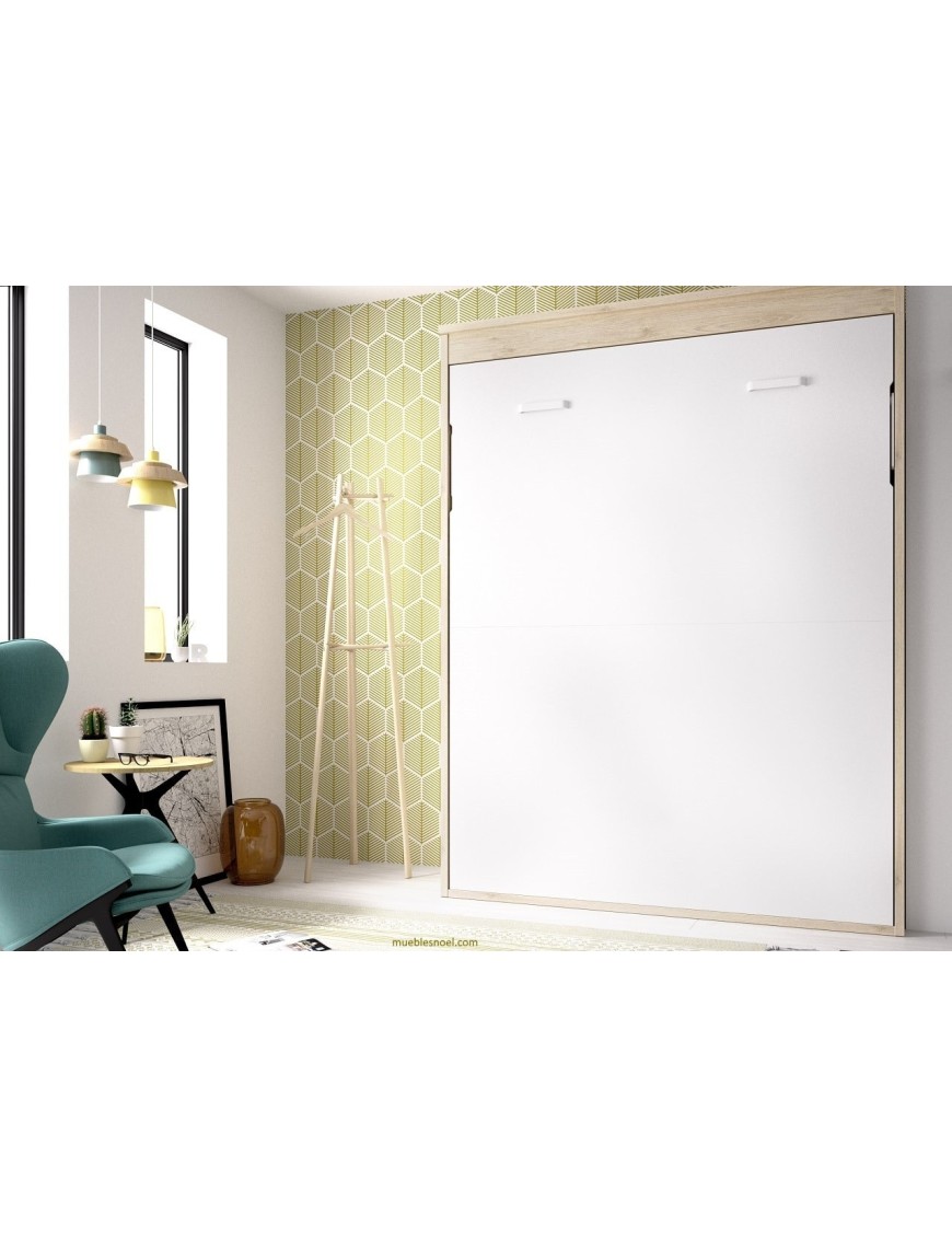 Las medidas totales de la cama abatible vertical de matrimonio son Largo 155,2 cm, Fondo 37cm (sin librería), Alto 220cm y con la cama abierta 206cm desde la pared hasta los "pies" de la cama.