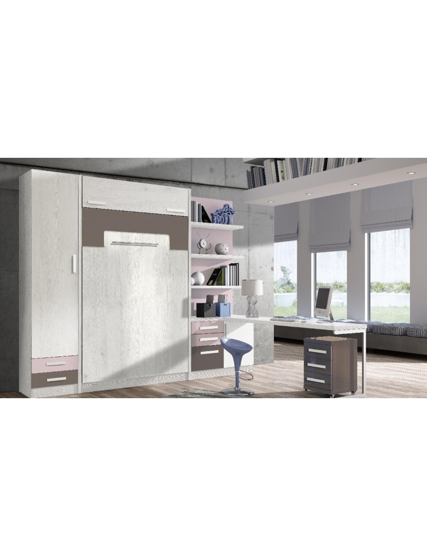 Lo podemos fabricar con una mesa estudio sincronizada por delante (529€ para 135 cm), tapar con un tablero el somier pequeño de arriba con lo que al abrir la cama de matrimonio queda más estético (126€), quitamiedos tapizado por 189€ más, iluminación interna por 139€ más, ocultar el sistema de amortiguación hidráulico con unas piezas que cuestan 50€ y cambiar la medida del mueble para colchones de 190 cm y 180 cm de largo por 160 cm, 150 cm y 135 cm, o ampliando la profundidad del mueble a 62 cm en vez de 52 cm lo que nos proporciona mayor capacidad para meter un colchón con más grosor (15 cm), cambiando el precio según la combinación de medidas deseadas, pregúntenos para saber el precio.