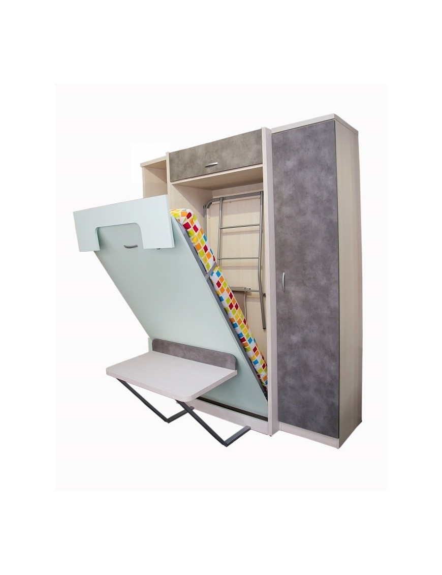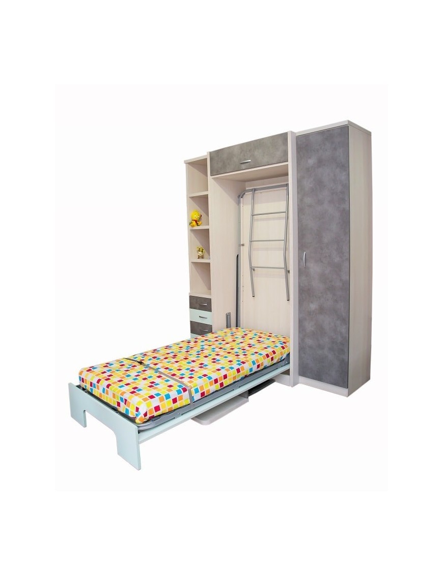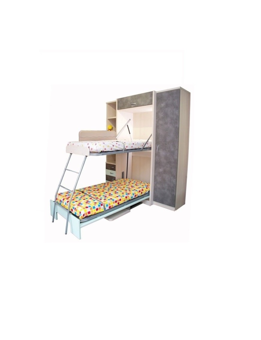 Mueble cama litera abatible vertical Madrid Solutions, puedes disponer de solo una cama o convertirla en litera, la escalera va integrada en el somier. Los opcionales no incluidos en el precio son: mesa, luz, barrera, maletero, armario y estantería con cajones.