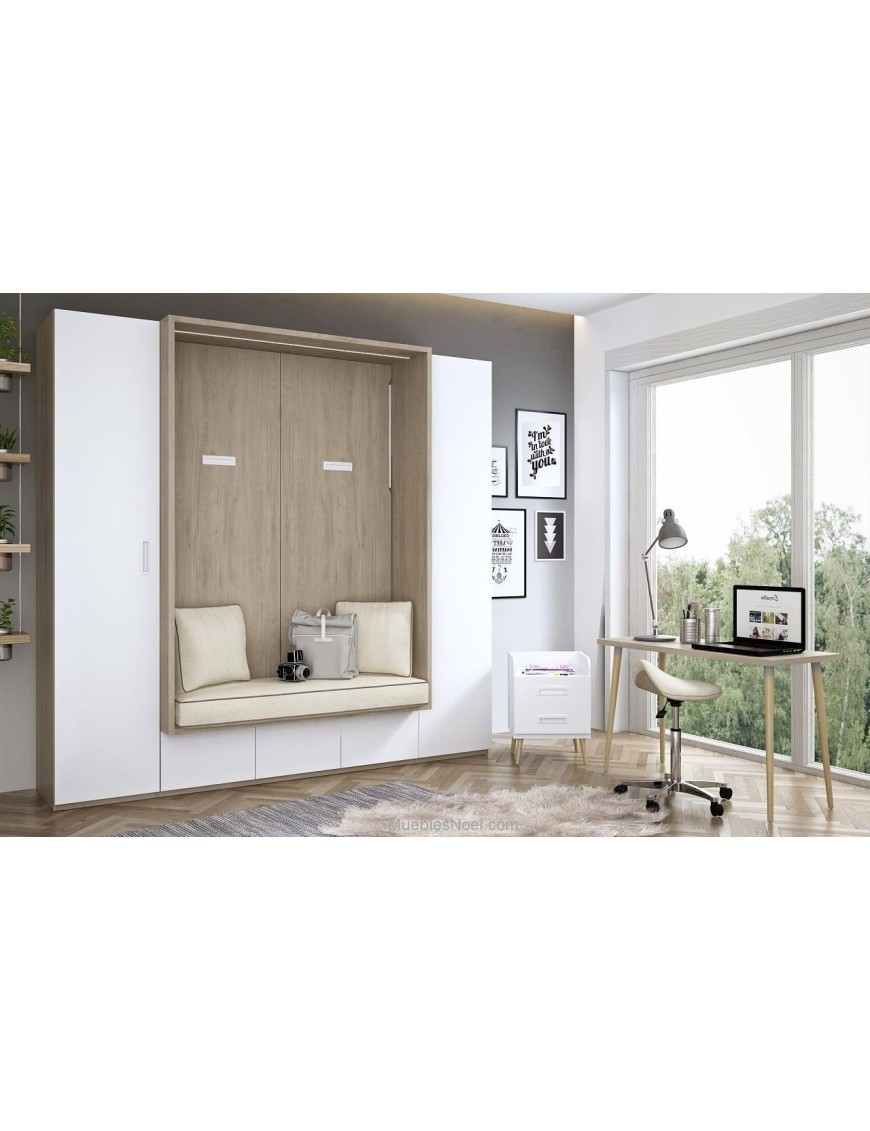 Completo dormitorio moderno de matrimonio con todo lo que se necesita ocupando el menor espacio posible. Consta de 2 armarios de 40cm, una cama abatible vertical doble con apertura de patas automáticas para colchones de 180x120cm que la estructura mide 137, un banco con tres cojines y por último unas puertas situadas debajo del asiento. Todo ello ocupando 218cm por 230cm de alto por 68cm de fondo y 213cm con la cama abatible vertical con asiento abierta con lo cual el resto de la habitación nos queda libre.