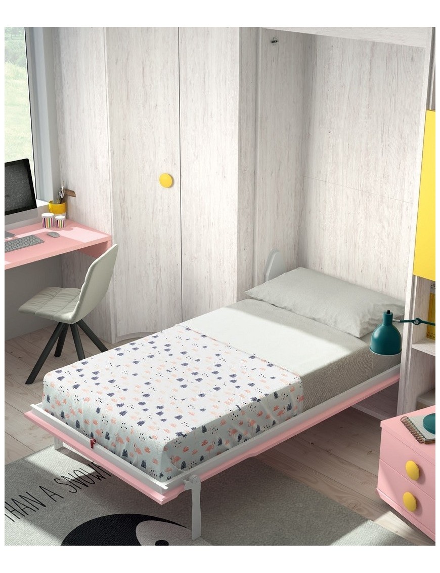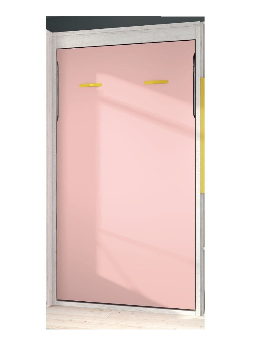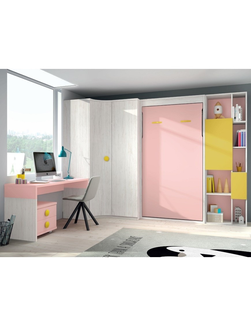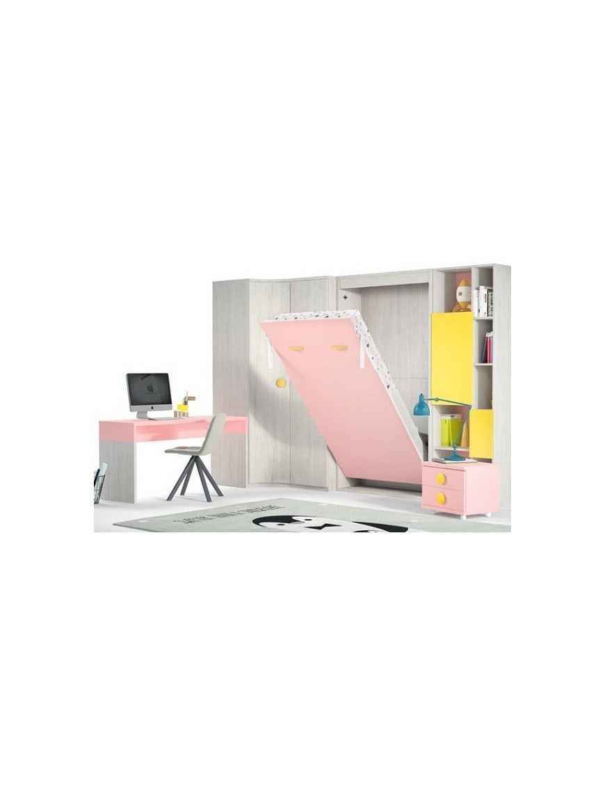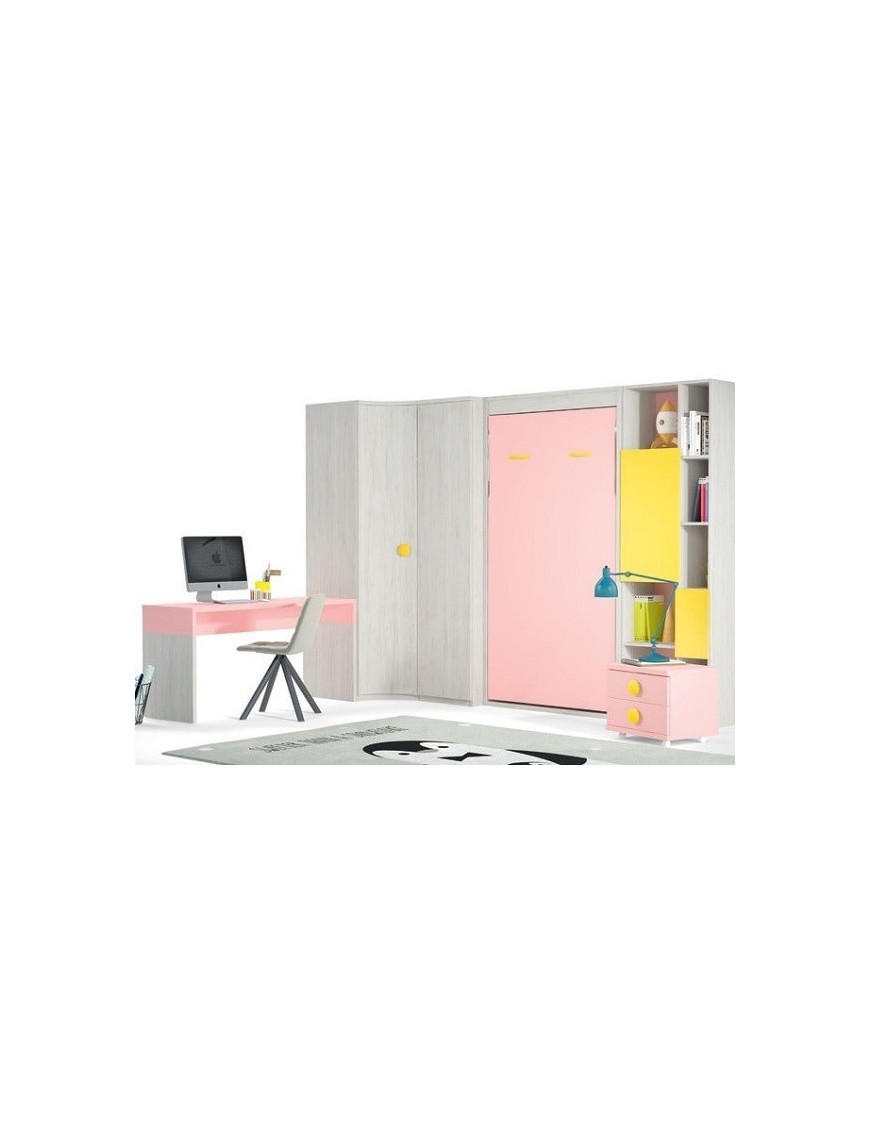 Los colores del hábitat juvenil de los muebles que acompañan a la cama abatible vertical y que no están incluidos en el precio son el Ocre, Rosa y el Ártico con Metal Curvo y Seta, mide 314x236 cm y se compone de: