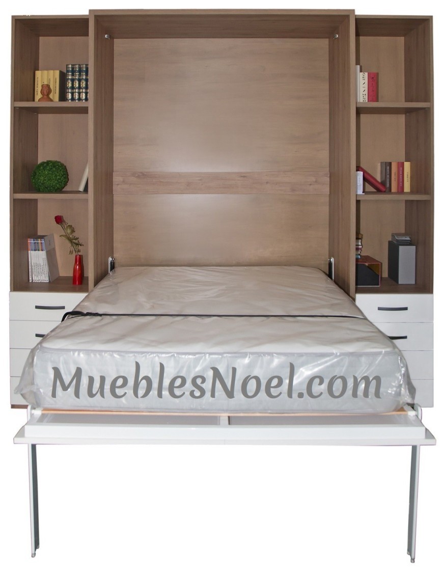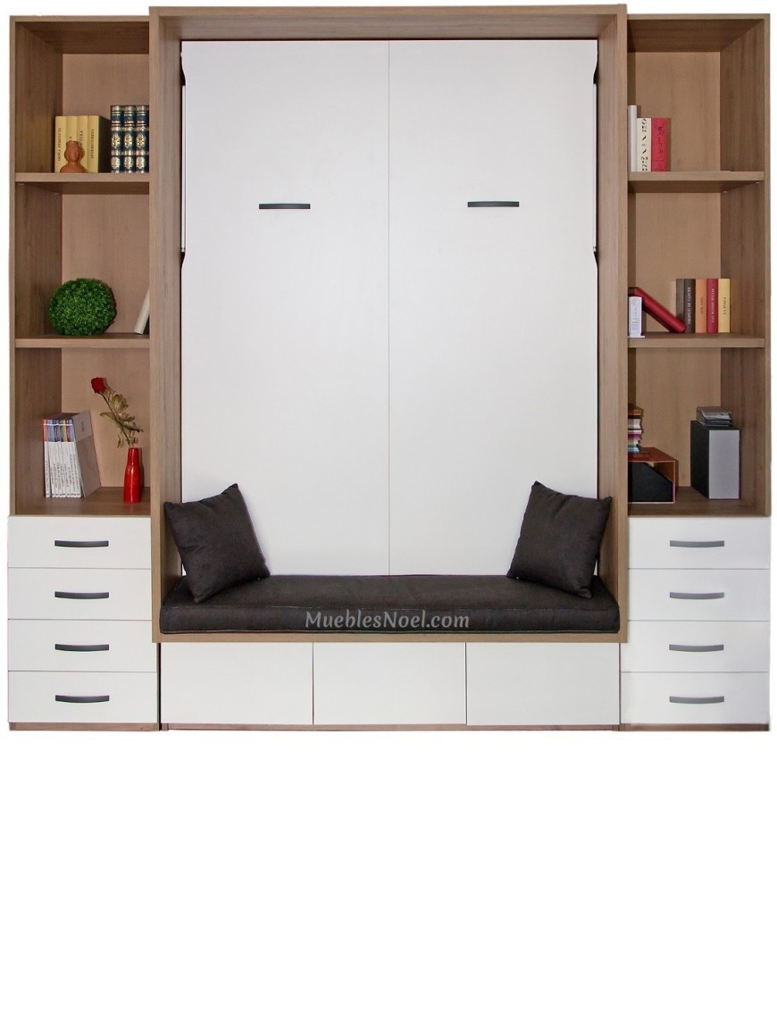Promoción de cama abatible moderna, para colchones de matrimonio de 135x190x24cm, con pequeño asiento con cojines, dos librerías con cajones y guarda objetos con puertas modelo Profunda.