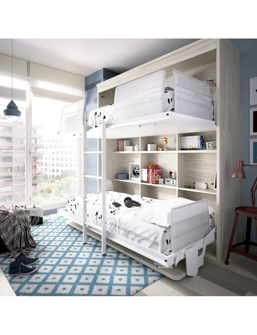 Las camas literas plegables con escritorio sincronizado System Madrid de Muebles Noel son para uso diario. Si tiene una habitación reducida, y necesita espacio para dos personas, está es una solución tanto para algo esporádico como para uso diario. La litera abatible con mesa está pensada para niños o adultos ya que aguanta un peso de hasta 160 kg por cama.