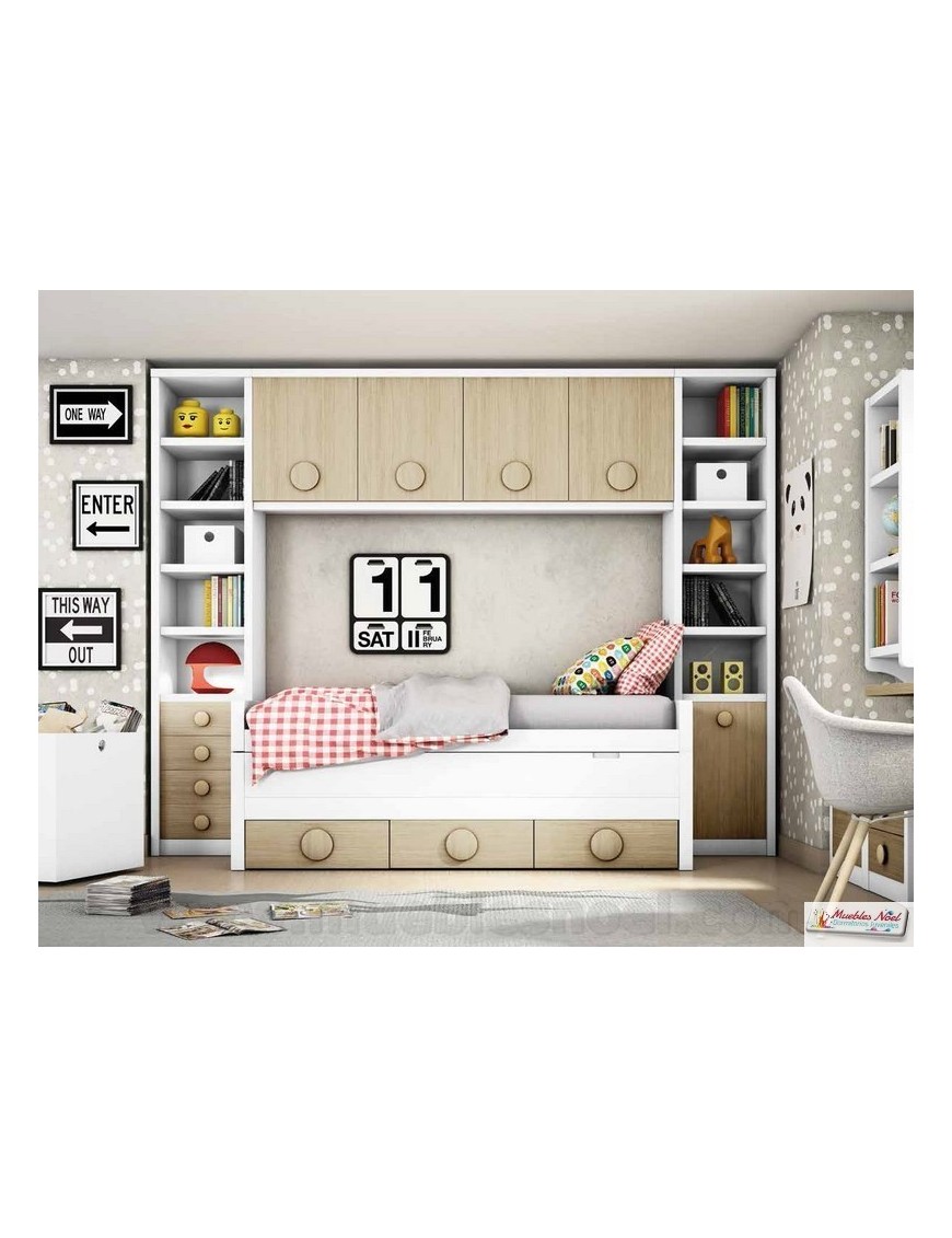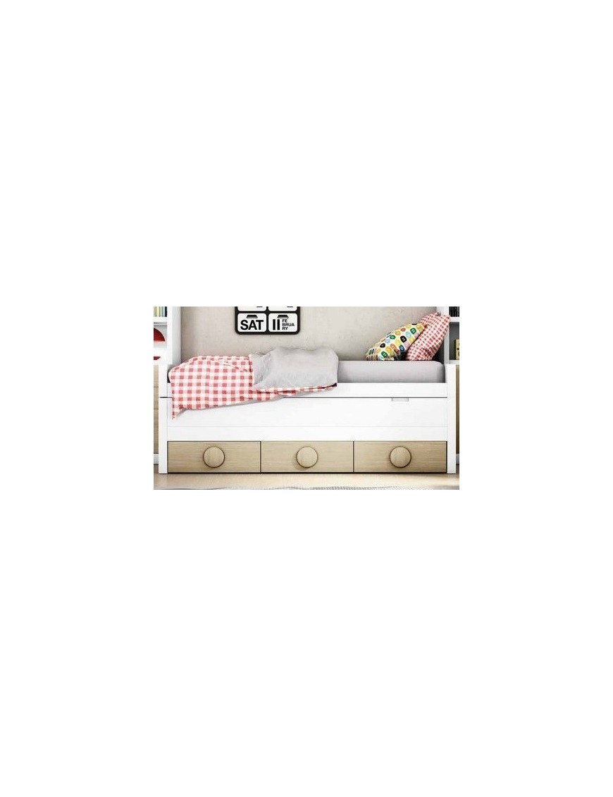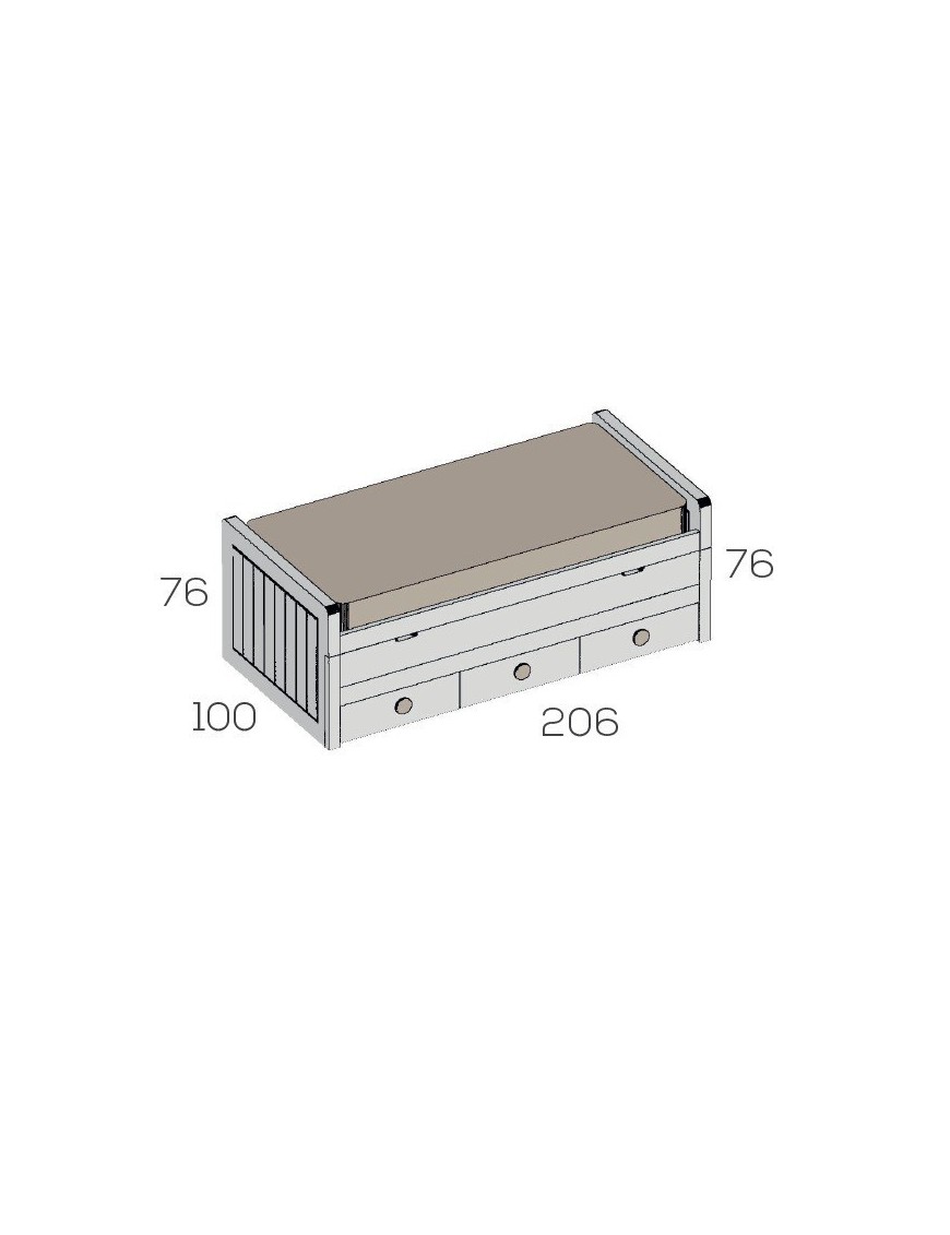 Cama compacta con cajones para colchones de la misma medida, 190x90 cm. El hueco útil para la cama metida es de 26 cm, con lo que restando un somier y la ropa de cama nos entra perfectamente un colchón de 20 cm de grosor. Fabricamos la camanido con cajones y 2 camas para las medidas de colchones de 190 y 200 cm de largo por 90 y 105 cm de ancho. Consulten las medidas totales y el precio de la combinación deseada. Se puede poner abatible el tablero que oculta el colchón de la cama metida con el fin de que si se utiliza para sentarse sea más cómodo. Las medidas totales son de 100 cm de fondo por 206 cm de largo por 76 cm de altura.