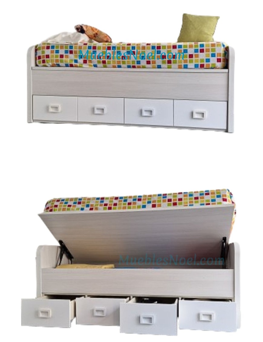 ConsúltanosCama compacta juvenil para colchón de 90x190 con tableros gruesos y redondeados con canapé abatible, cuatro cajones con guías metálicas y base de tablero en los colores fresno y blanco mide 206x11x80 de alto.