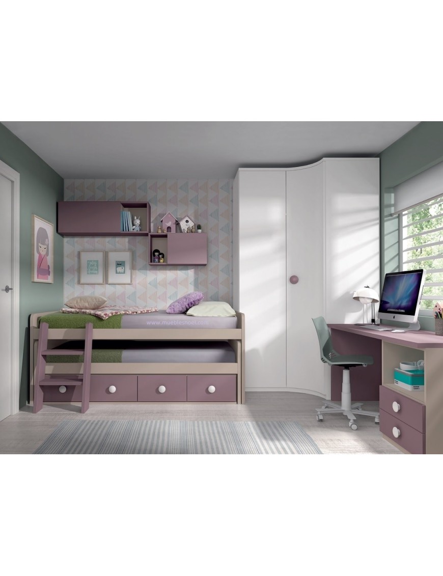 El resto de los muebles juveniles del dormitorio que acompañan a la cama compacta Valdebebas que se pueden ver en alguna de las fotos, no están incluidos en el precio ni en las medidas. La descripción completa incluyendo la cama juvenil compacta y la escalera son los siguientes: