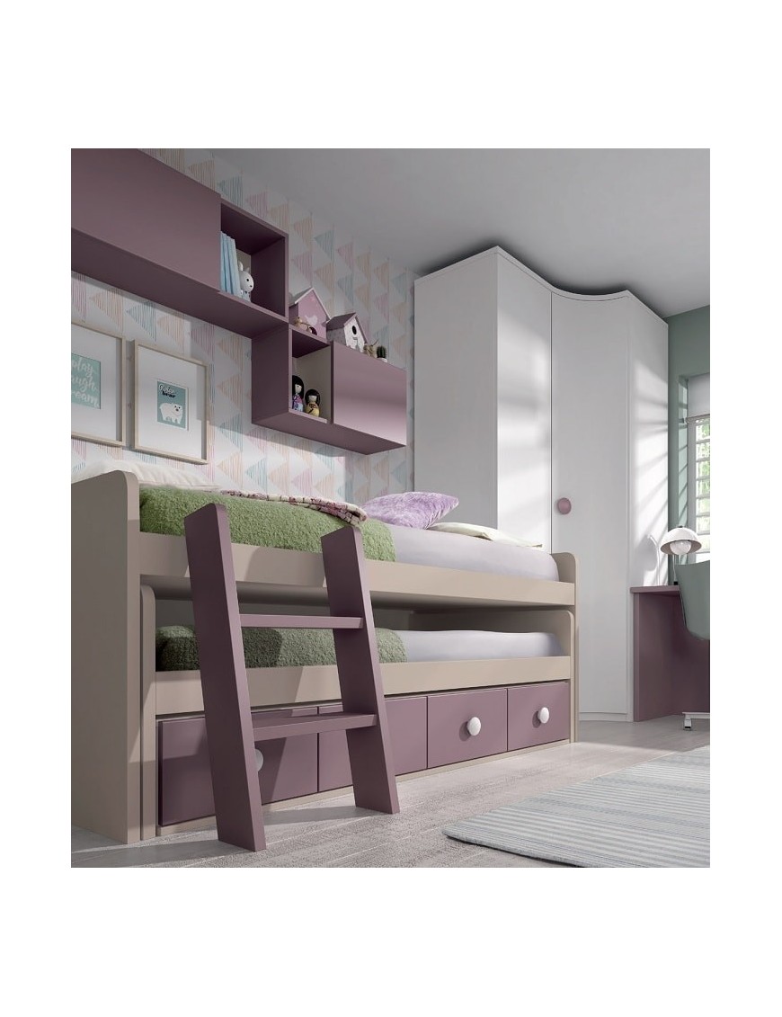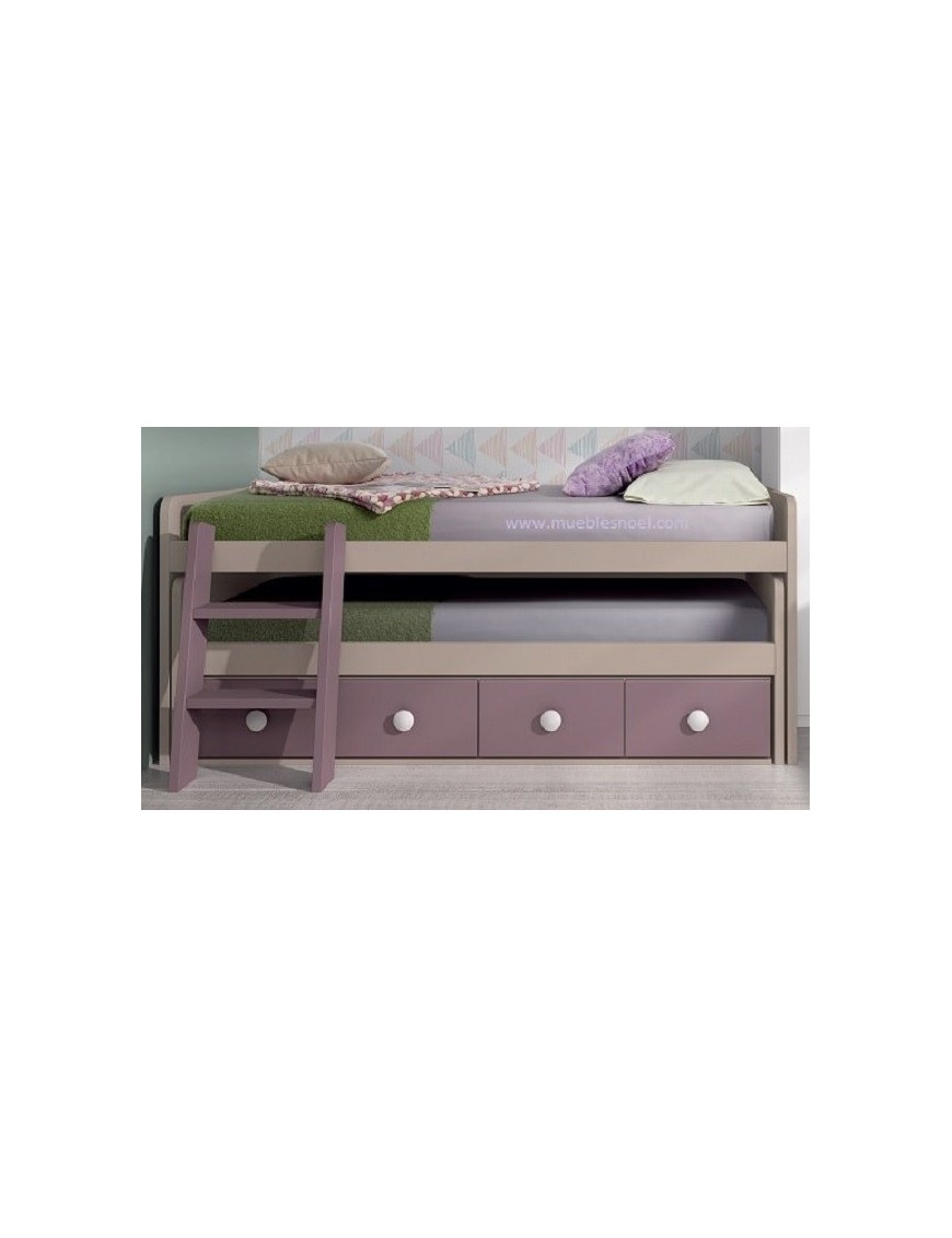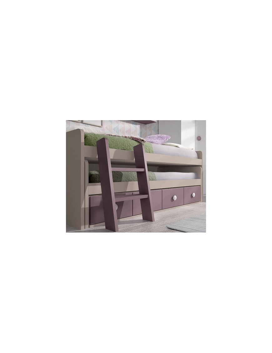 Es una cama compacta con escalera, fotografiada en los colores Lila y Tierra. Tiene cuatro cajones, una cama deslizante para somieres y colchones de 80x180 cm, otra cama, esta vez fija, para colchones de 80x190 cm y por último una escalera. El mueble cama mide en total 203 cm de largo por 91 cm de fondo por 83 cm de alto de los laterales (la altura desde el suelo hasta el colchón depende del grosor del colchón). El hueco para la ropa de cama, el colchón y el somier de la cama deslizante es de 29 cm. No necesita somier en la cama principal, tiene tablero con refuerzos metálicos.