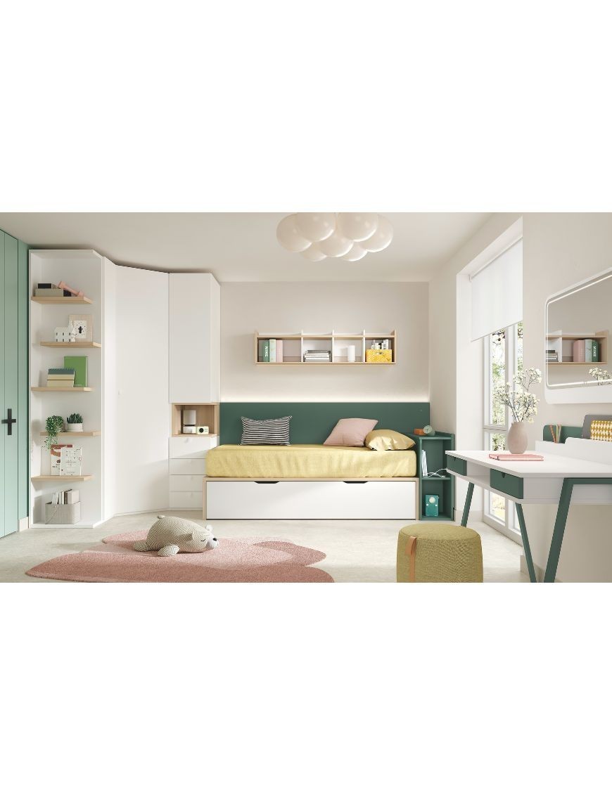 - Camanido con somier de arrastre elevable (190 x 90 cm): una solución versátil para invitados o hermanos, que se convierte en cama doble a la misma altura.