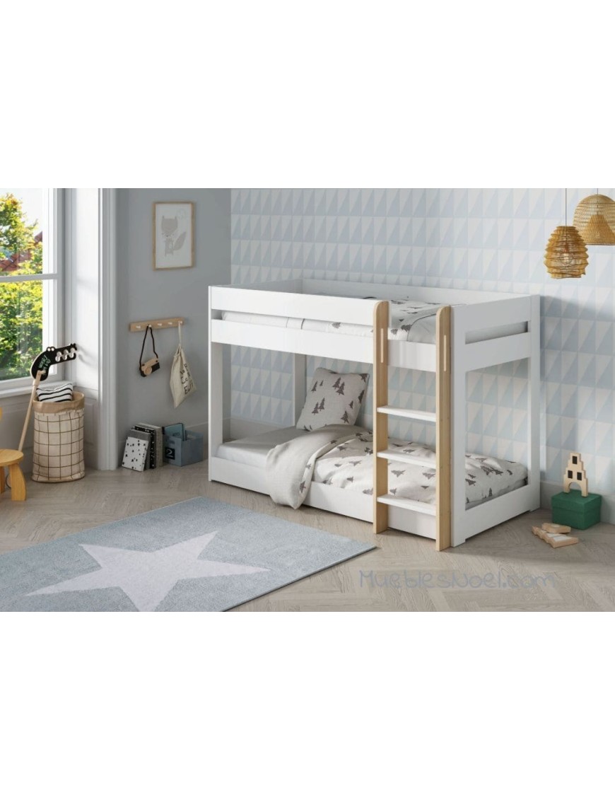 Litera Arlequín Montessori con la cama baja al ras del suelo para que puedan acceder cómodamente tus hijos. Es maciza y lacada en blanco o en verde. Es para colchones de 90x190cm. Incluye los somieres. Mide Largo: 197 cm. Ancho: 107.5 cm. Alto: 131.5 cm