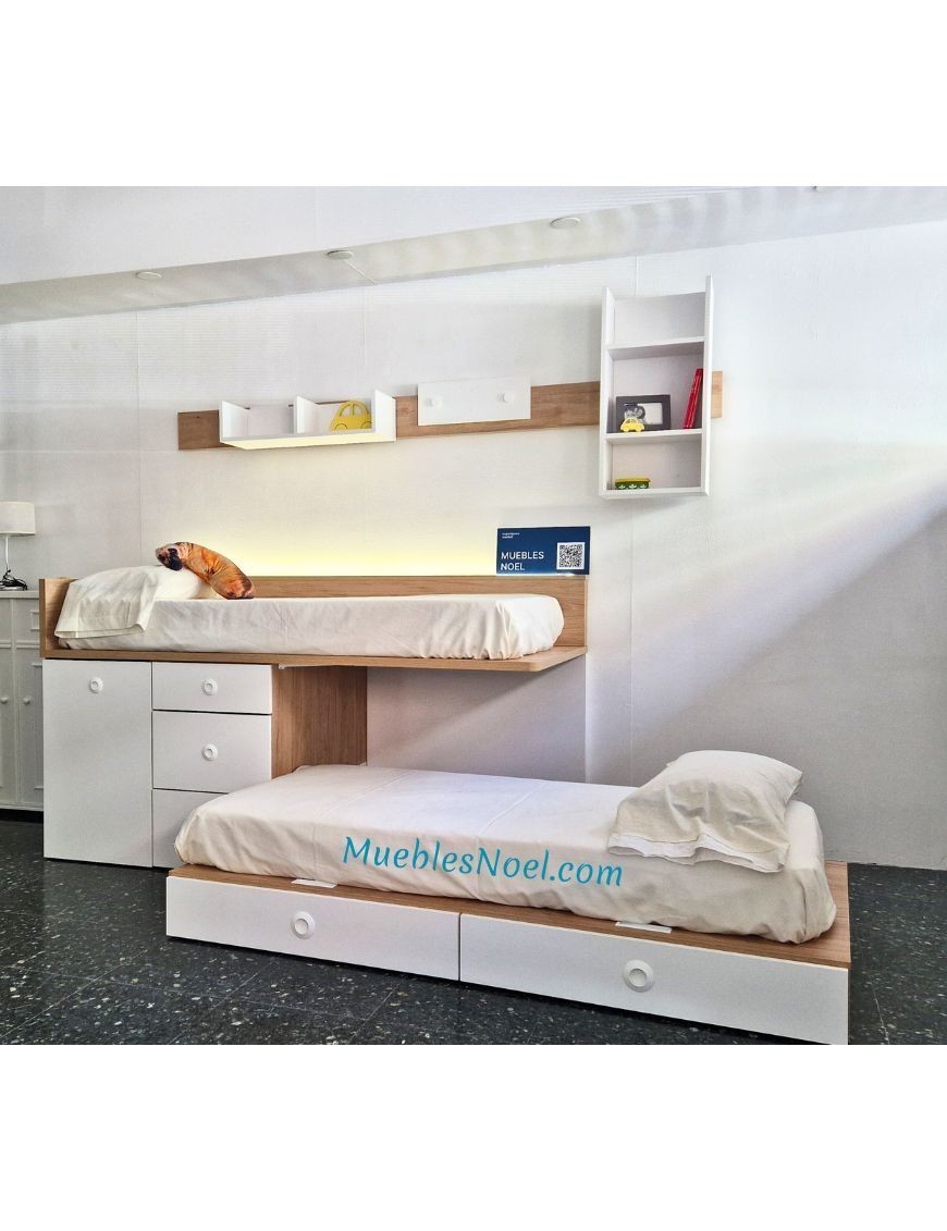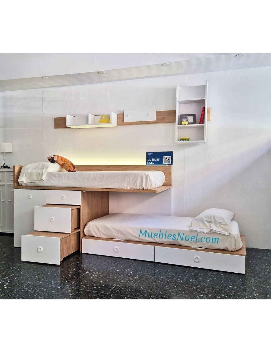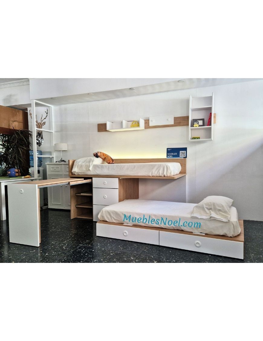 La litera juvenil "Sonrisas en Altura" en tonos de madera y blanco es una excelente opción para habitaciones pequeñas que requieren soluciones inteligentes y funcionales. Diseñada para acomodar a dos niños, esta litera presenta una estructura baja que optimiza el espacio disponible y brinda comodidad. Incluye una práctica escalera con cajones integrados, que no solo facilita el acceso a la litera superior de forma segura, sino que también ofrece espacio de almacenamiento adicional para guardar juguetes, ropa de cama u otros objetos. Además, cuenta con una mesa extraíble, que añade versatilidad al mobiliario al proporcionar un área de estudio o juego cómoda y funcional.