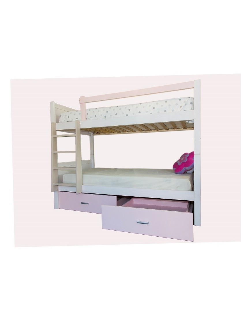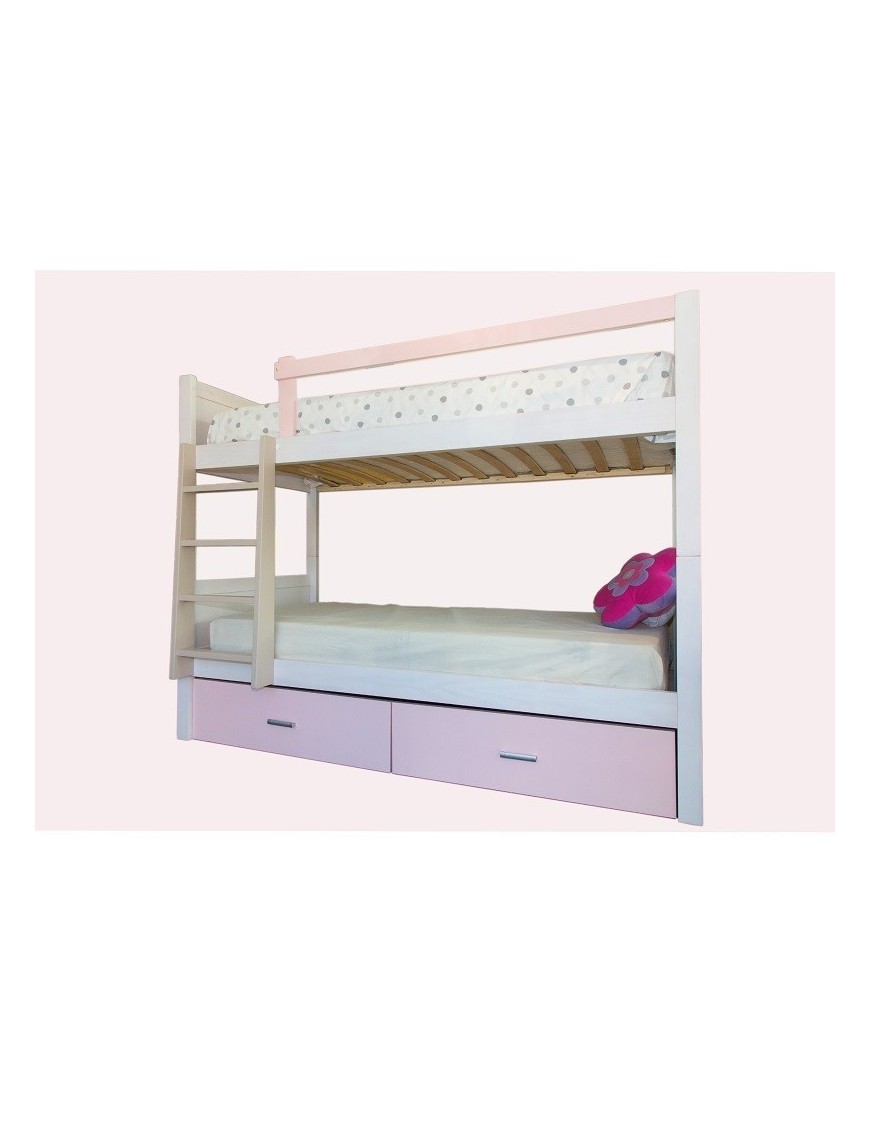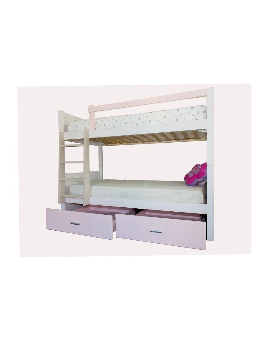 La litera Rosa Nube incluye dos cajones de gran capacidad, tipo bandeja de 9cm de alto, ideales para guardar juguetes o ropa de cama, los somieres también de madera maciza y dos tapas laterales que ocultan los huecos de los lados de los cajones. Es para colchones de 90x190 cm con unas medidas exteriores de 208 cm de largo, tiene dos fondos, por el lado que está la escalera mide 109cm totales, y por el lado que no tiene escalera son 100 cm. La altura total es de 160 cm. También se fabrica para colchones estándar de 80, 90 y 105 por 180, 190 y 200 de largo variando las medidas totales y el precio. Consúltennos el precio de la combinación de medidas y/o colores deseada.